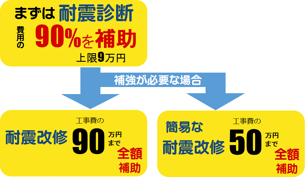- 地震に対して倒壊することの無いレベルまで、安全性の向上を図る工事について、耐震改修工事に要する費用全額(90万円を限度)を補助します。